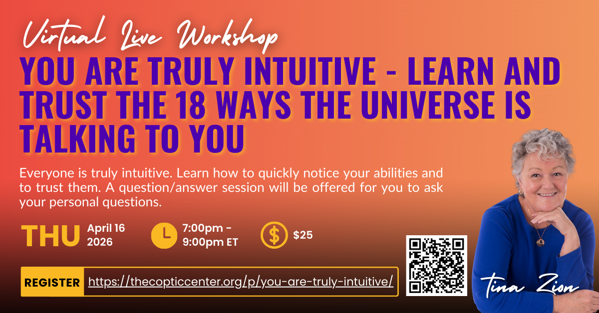 Date Apr 16, 2026 Time 7:00 pm - 9:00 pm Virtual Live Workshop: You Are Truly Intuitive – Learn and Trust the 18 Ways the Universe is Talking to You with Tina Zion Facebook X Email Share this event + Add to Google Calendar + iCal / Outlook export 00 days 00 hours 00 minutes 00 seconds